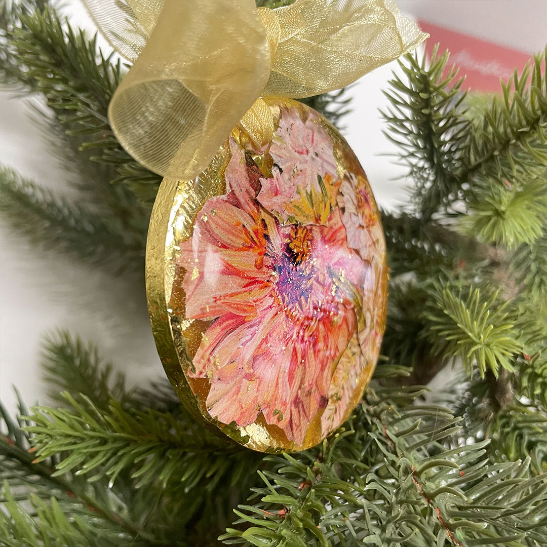 Each ornament is a miniature work of art, featuring a resin-coated collage of archival, hand-cut canvas prints from Laura’s Hello Beautiful Collection. The back  is adorned with pressed gold leaf, adding a luminous finish that makes every piece beautifully unique.