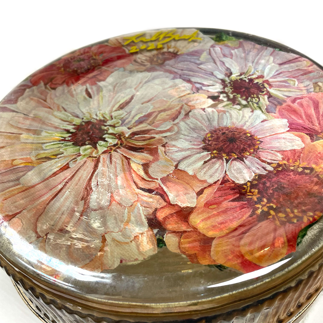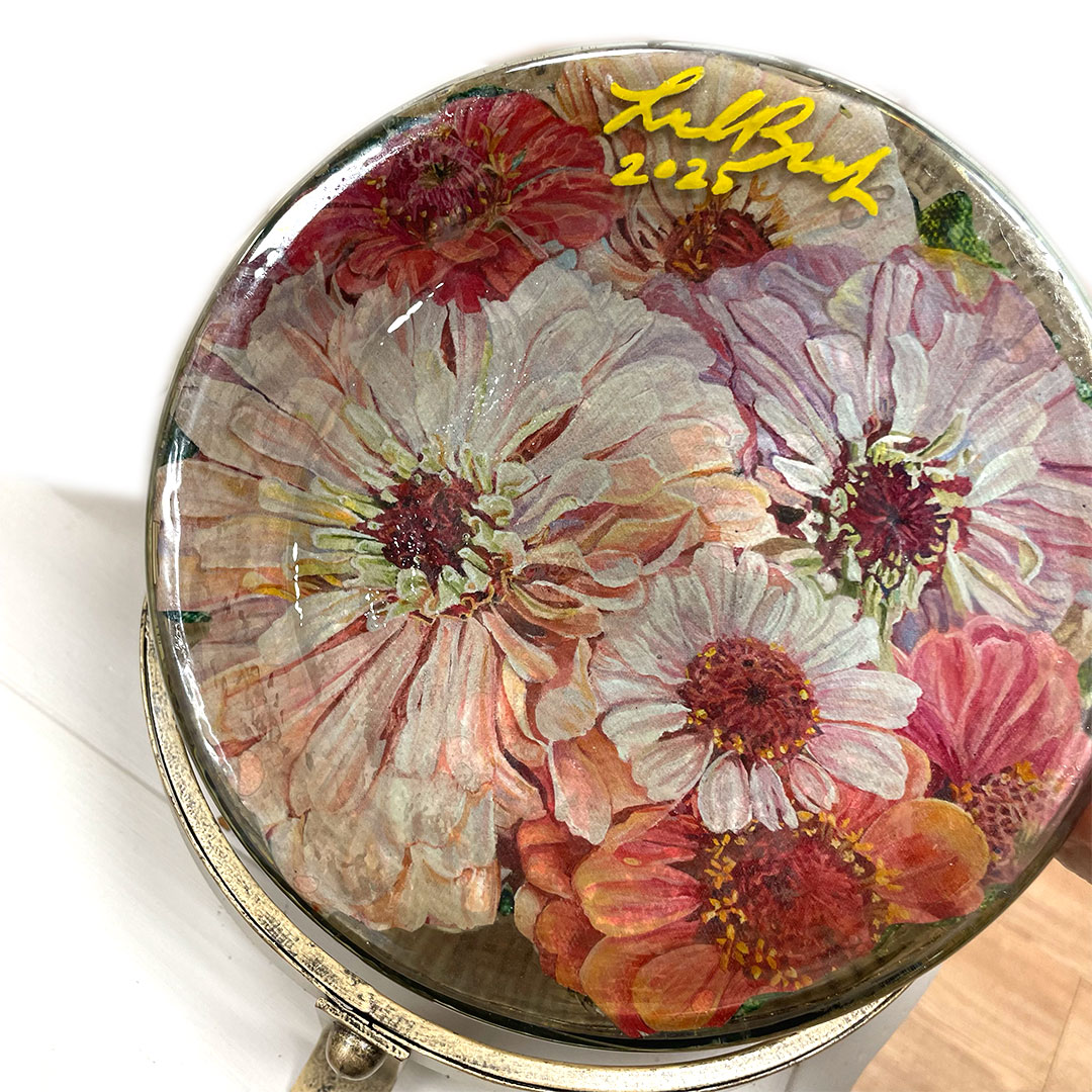 A resin-coated collage of archival-quality, hand-cut canvas prints from Laura’s original Hello Beautiful Collection. Each dish carefully is uniquely crafted to last and delight. The glass dish can be flipped to reveal additional flowers, allowing it to be used both as a dish or a tray.