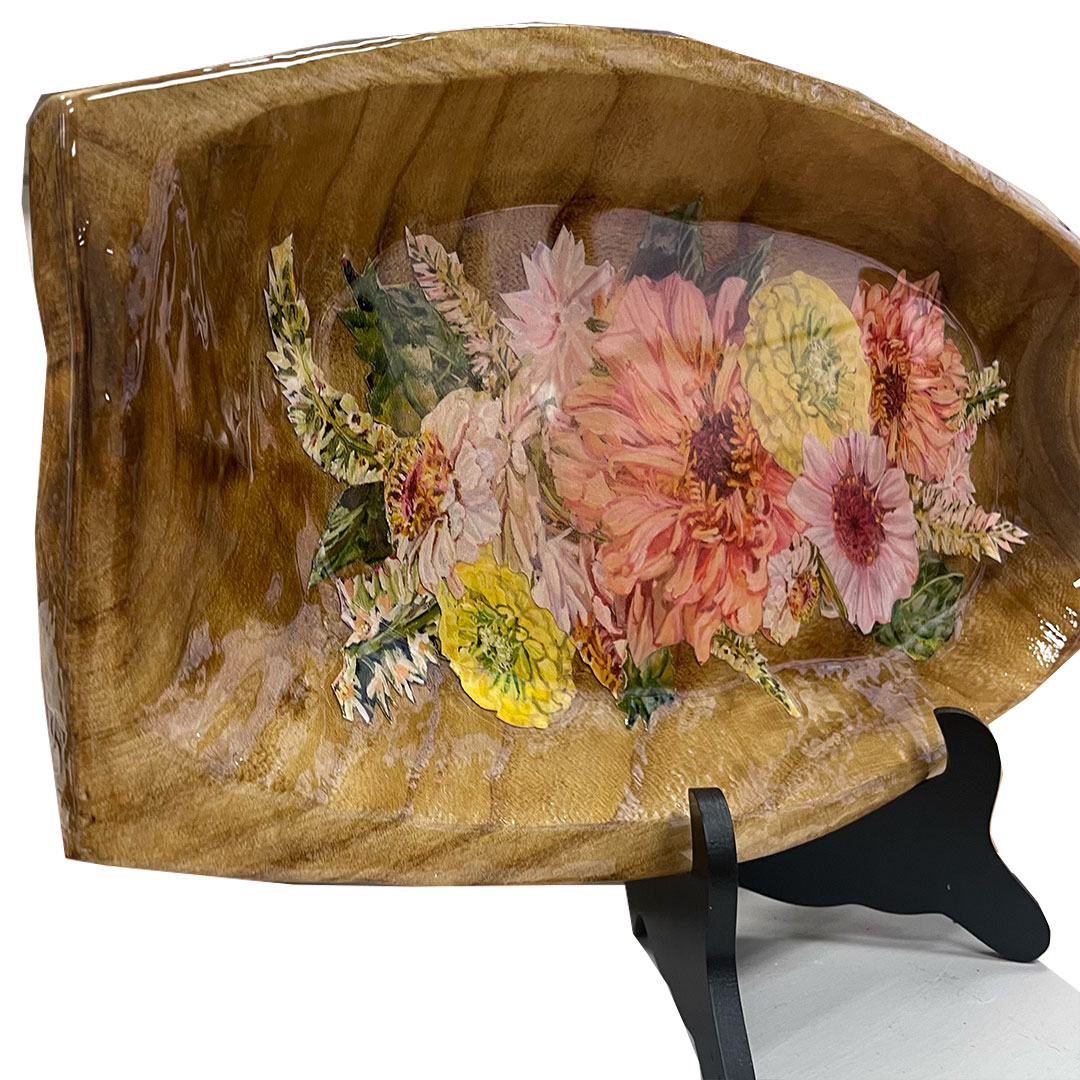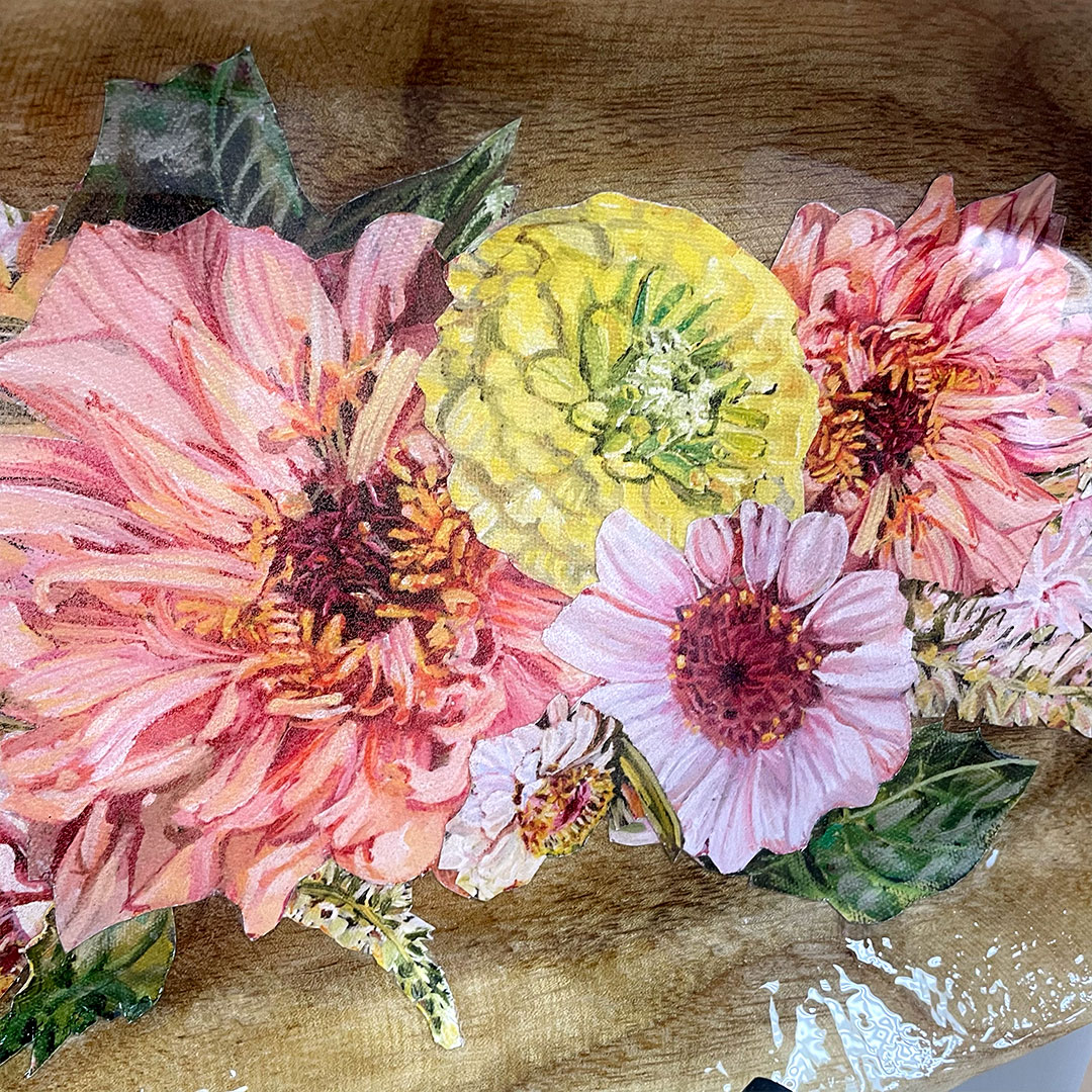 A resin-coated collage of archival-quality, hand-cut canvas prints from Laura’s Hello Beautiful Collection—each tray uniquely crafted for lasting beauty and joy.